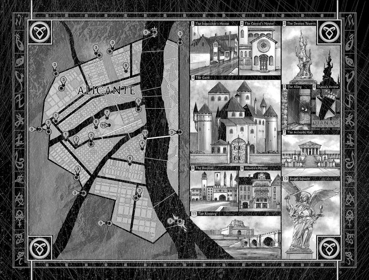 É a capital, e única cidade de Idris. O Gard, o lugar principal de encontro da Clave, e o Salão dos Acordos podem ser encontrados lá. Dizem que todas as ruas de Alicante levam ao Salão dos Acordos. Os prédios da Clave e as torres demoníacas, que controlam as barreiras da cidade, são feitos do material repelente de demônios chamado adamas.